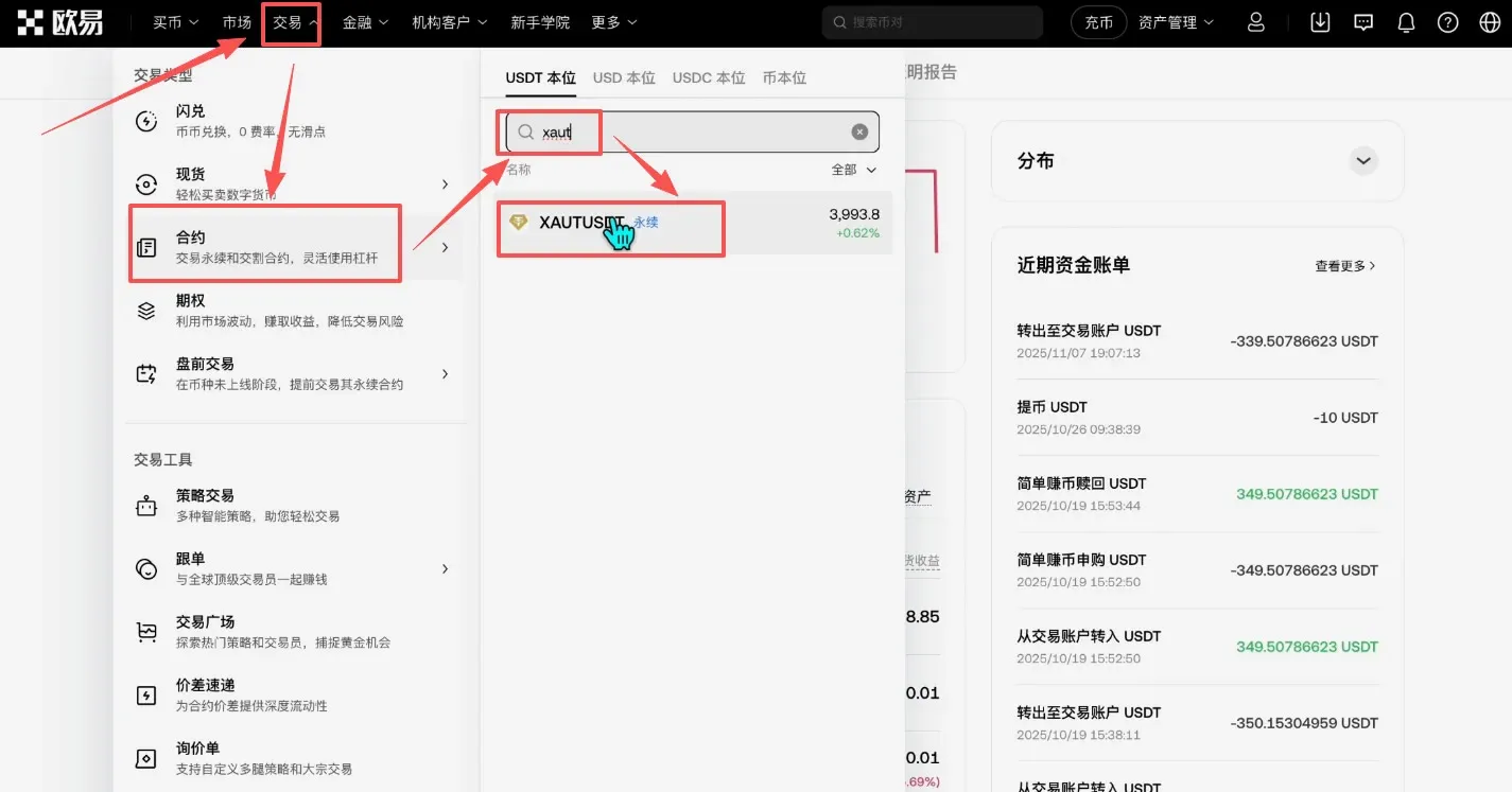 需要先在 OKX 完成账号注册和 KYC 认证,然后在平台充值 USDT,进入现货交易页面,搜索 XAUT/USDT 交易对,输入购买数量并确认即可完成买入。
