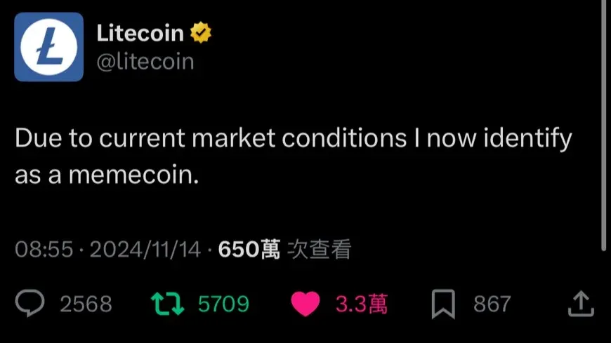- 2024 年 11 月:LTC 官方 X(原 Twitter)自嘲為 MEME 幣,引發社群模仿熱潮。11 月 15 日,官方發文稱「現在認同 LTC 是一種 MEME 幣」,短時間內帶動社群討論並輕度推升價格。!LTC 官方 X 帳號發布「現在認同 LTC 為 MEME 幣」的截圖